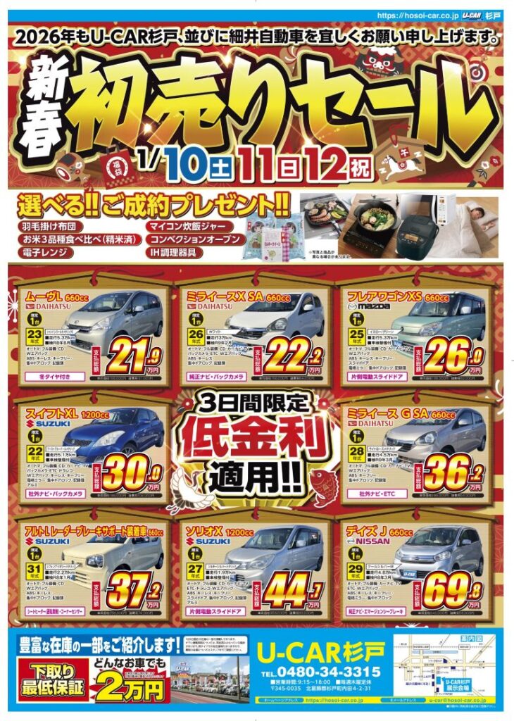 新春初売り開催! 1月10日(土)~12日(月)はU-CAR杉戸へ! お得な車が勢ぞろい。ぜひこの機会にお立ち寄りください。 ...