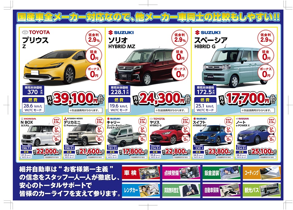 2024.02.23 ニュース 新生活応援フェア!開催中!! みなさんこんにちわ(^^) 細井自動車では下記日程にて新生活応援フェアを開催しております。 2月23日(木)~3月31日(日) この期間中は超特別低金利でのご提供が可能です!! お買い得車を多数ご用意してお待ちしております! 是非この機会にご来店ください!